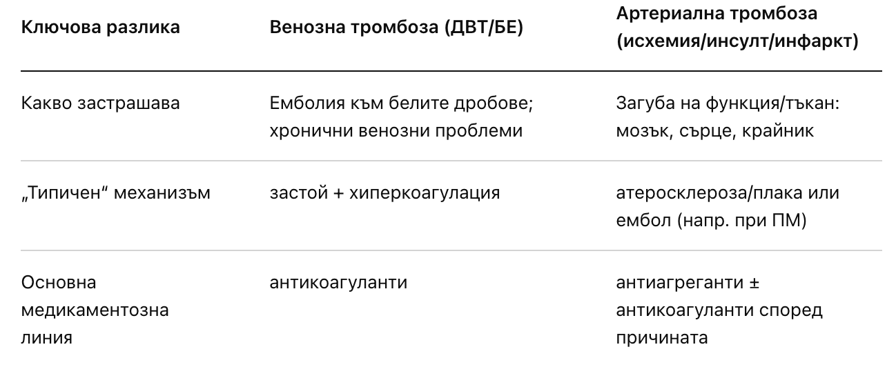 Защо лечението е различно? В общ план артериалните тромби са по-богати на тромбоцити („platelet‑rich“), а венозните – на фибрин и еритроцити („fibrin/RBC‑rich“), което обяснява защо при венозните тромбози ключови са антикоагулантите, а при артериалните – антиагрегантите и бързата реперфузия.