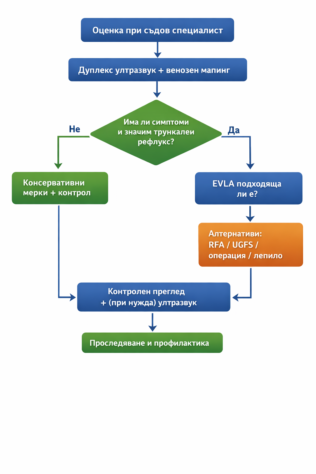 ESVS уточняват, че рефлукс на ултразвук сам по себе си не е „автоматична“ индикация – важно е да има симптоми/усложнения и ясна полза.